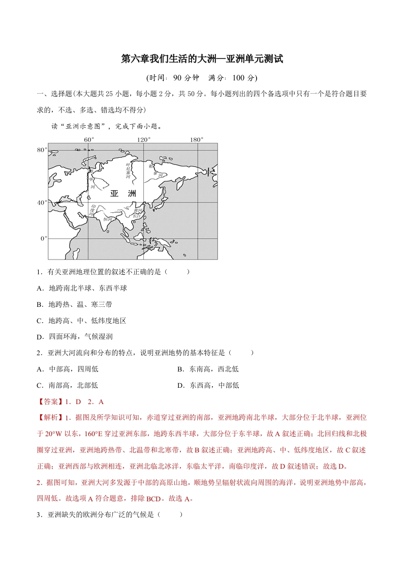 第六章我们生活的大洲——亚洲(单元测试)-七年级地理下册同步精品课堂(人教版)