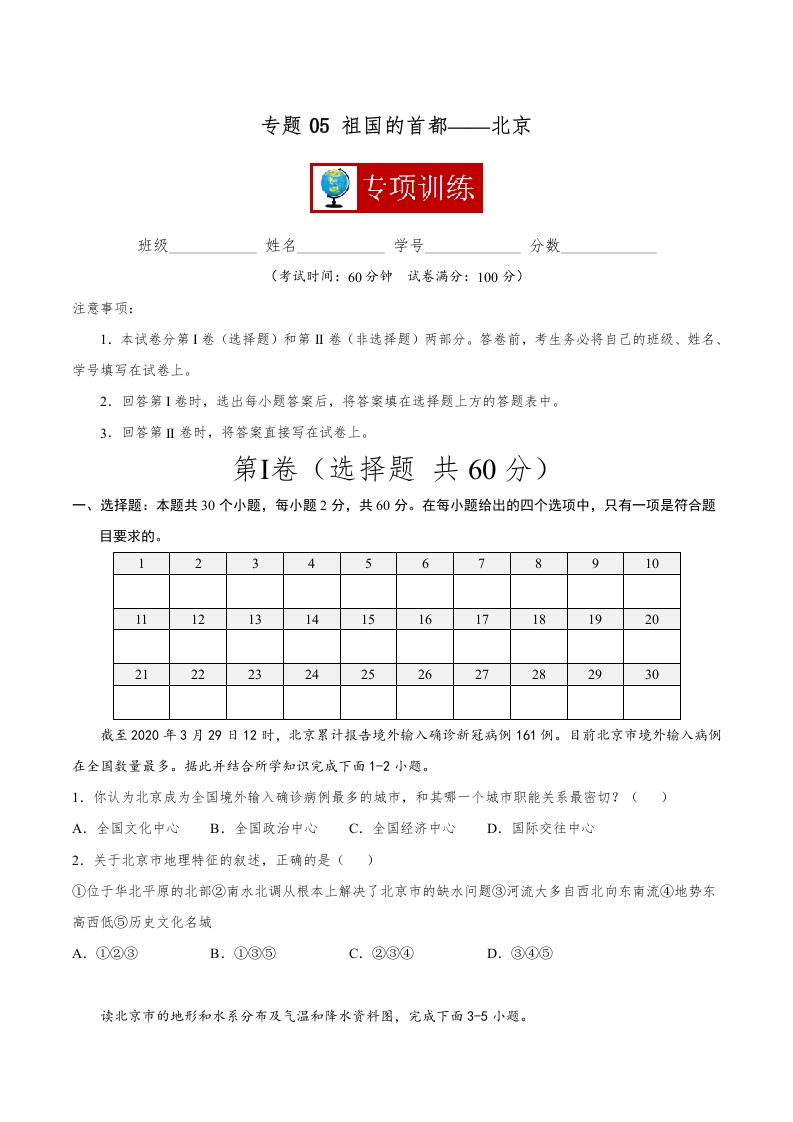 首页初中地理八年级专题05 祖国的首都——北京 【专项训练】-(人教版)(原卷版)