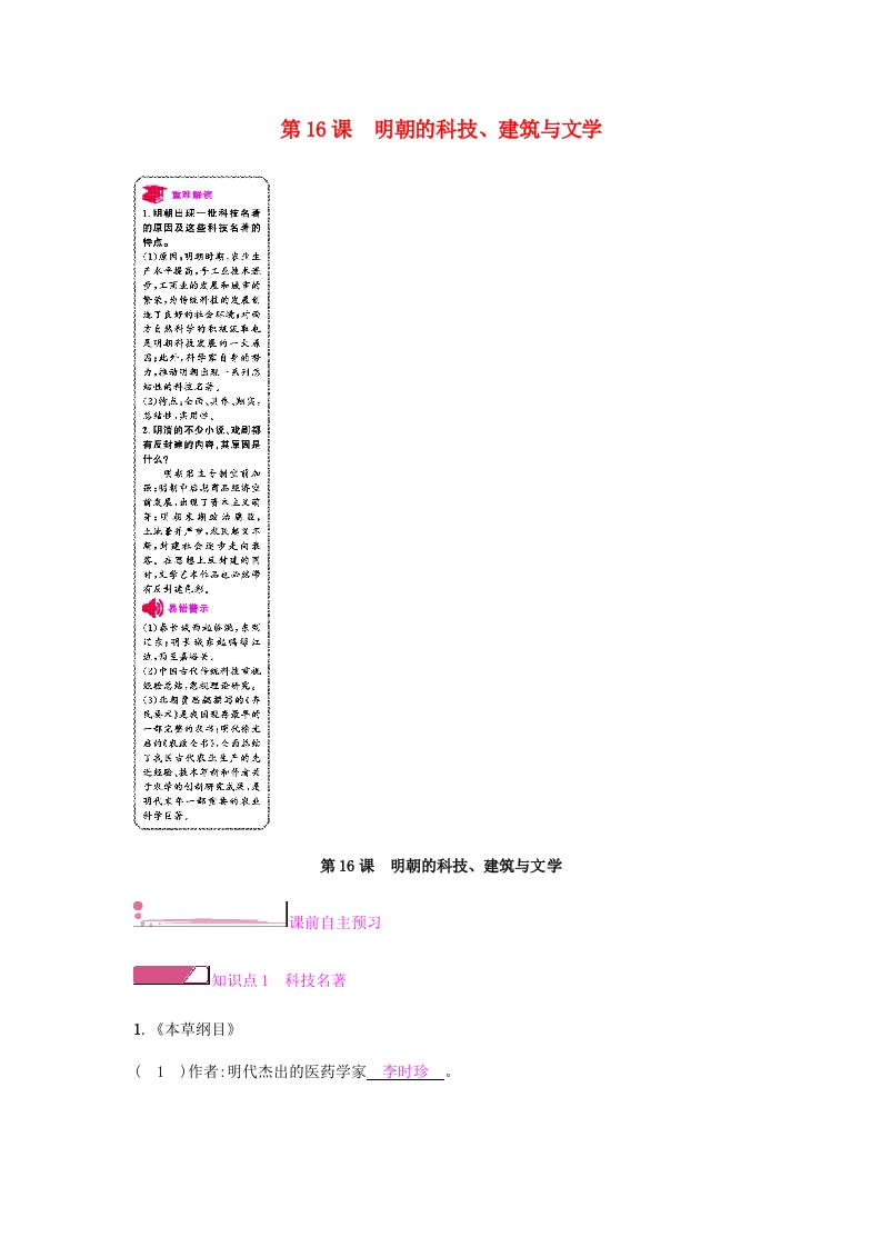 七年级历史下册第三单元明清时期统一多民族国家的巩固与发展第16课明朝的科技建筑与文学课时作业新人教版20190220245