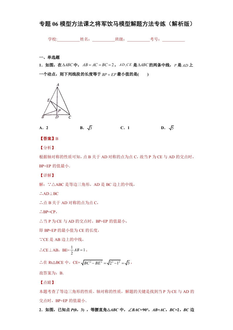 首页初中数学八年级八年级数学上册专题06模型方法课之将军饮马模型解题方法专练(解析版)(人教版)