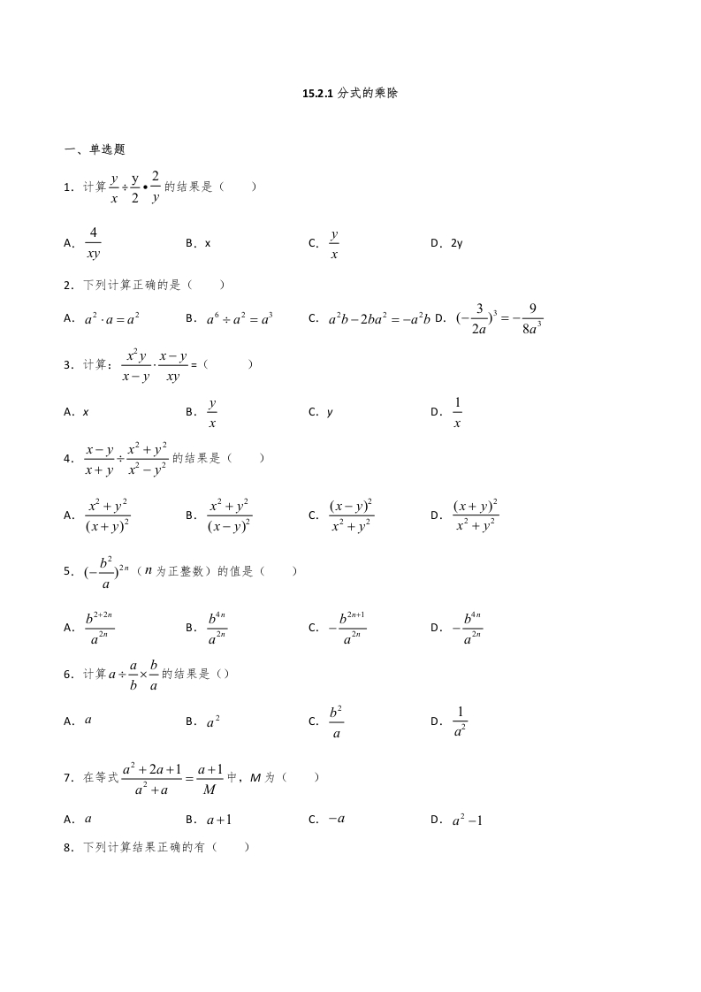 八年级数学上册15.2.1分式的乘除(原卷版)