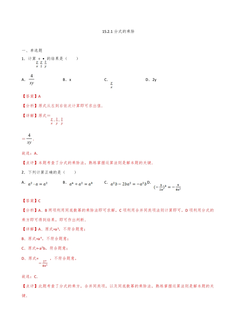 首页初中数学八年级八年级数学上册15.2.1分式的乘除(解析版)