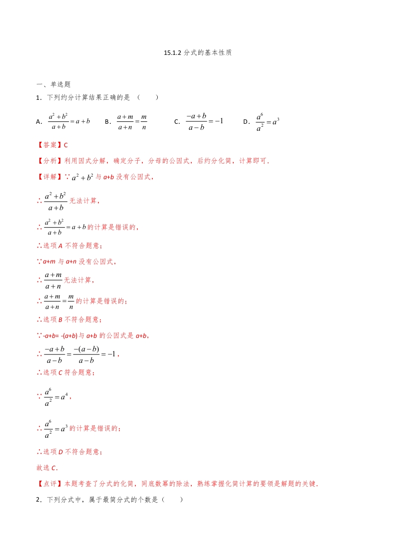 首页初中数学八年级八年级数学上册15.1.2分式的基本性质(解析版)