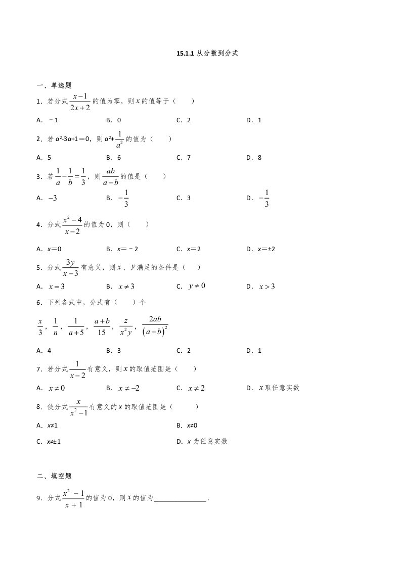 八年级数学上册15.1.1从分数到分式(原卷版)