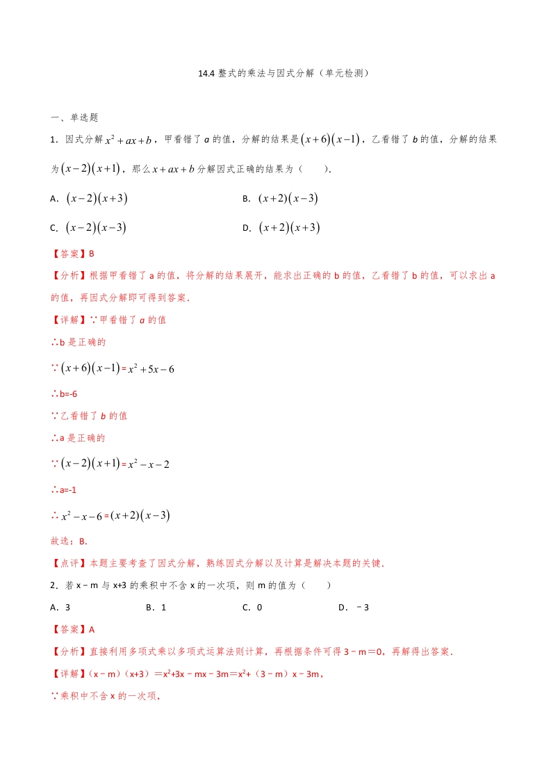 首页初中数学八年级八年级数学上册14.4整式的乘法与因式分解(单元检测)(解析版)