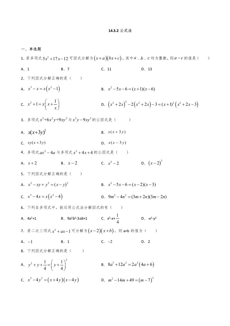 首页初中数学八年级八年级数学上册14.3.2公式法(原卷版)