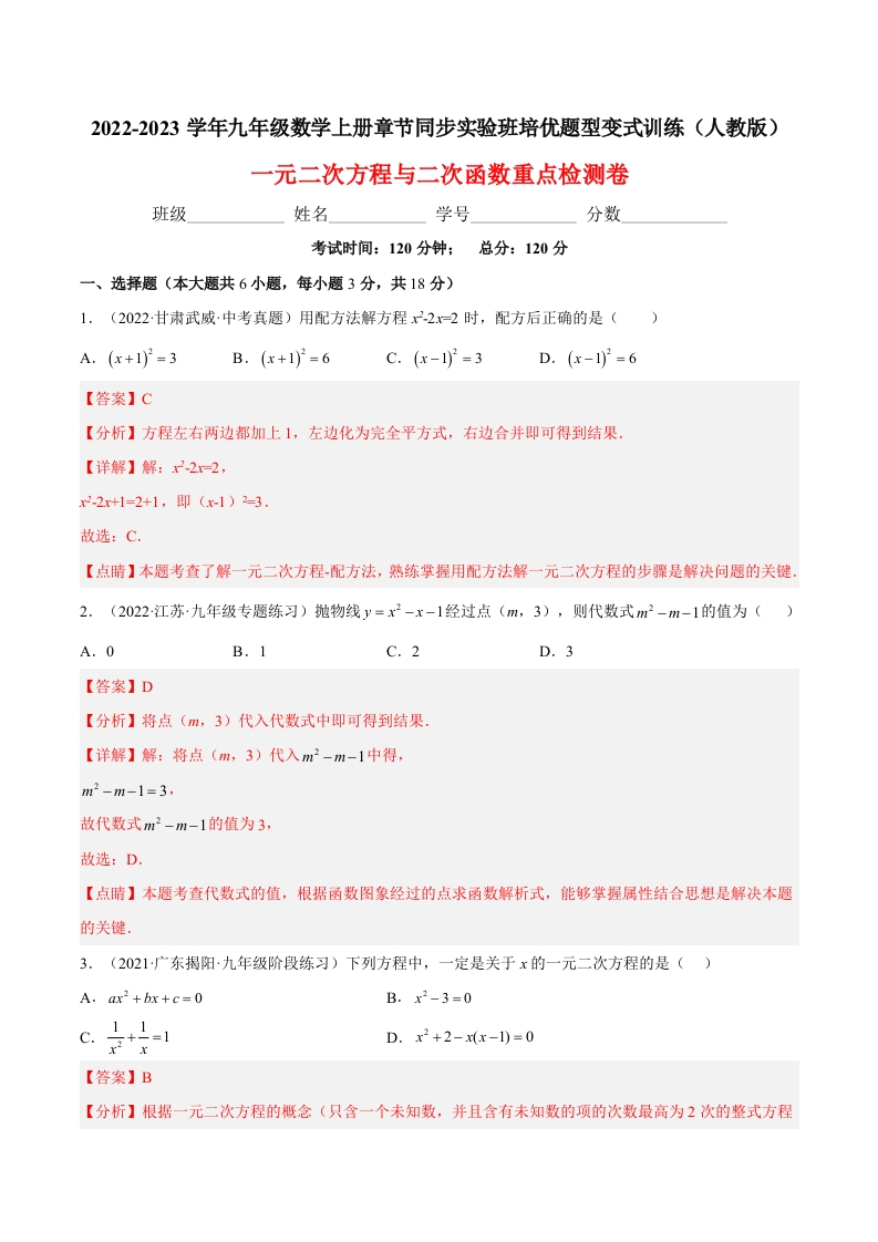 九年级上期末数学一元二次方程与二次函数重点检测卷(解析版)