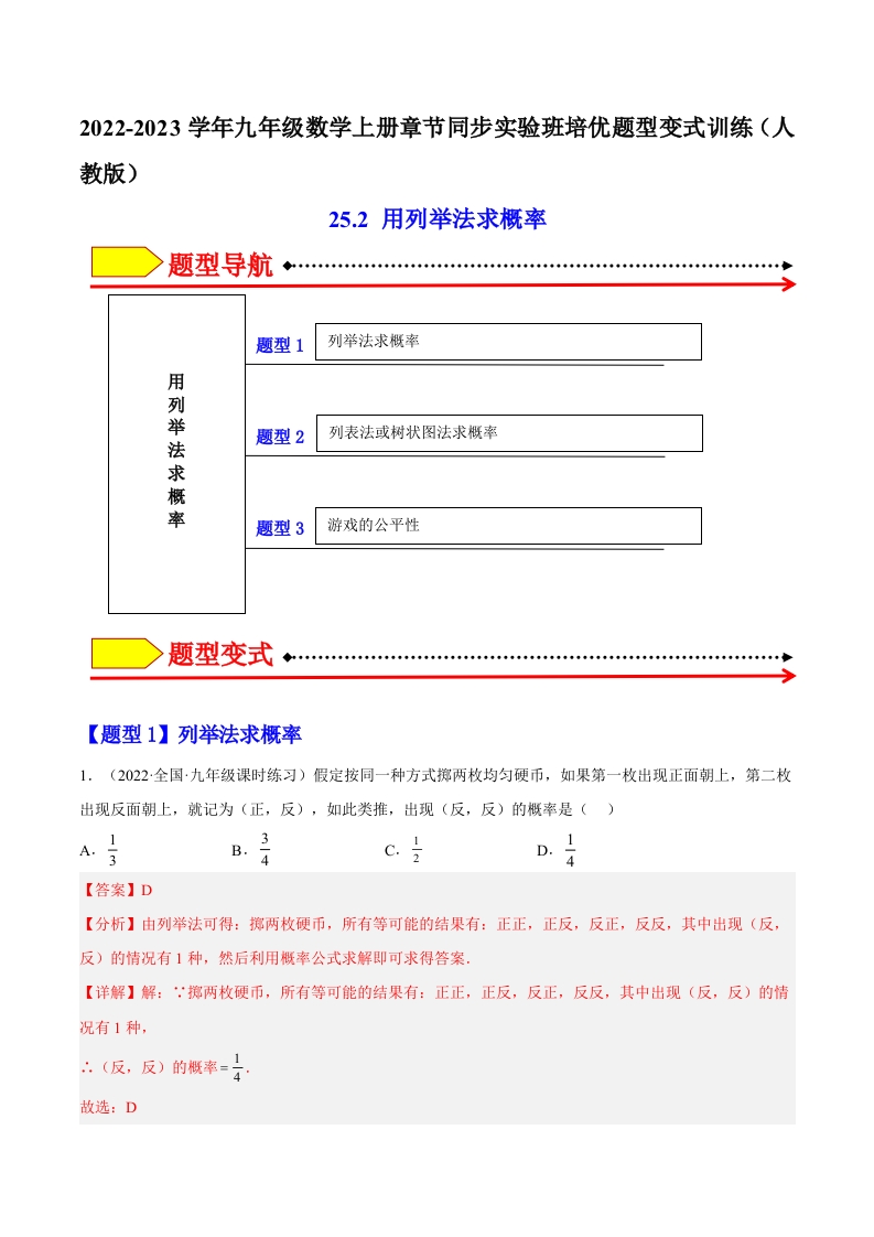 九年级上期末数学25.2 用列举法求概率(解析版)