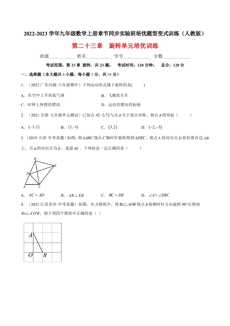 九年级上期末数学第二十三章 旋转单元培优训练(原卷版)