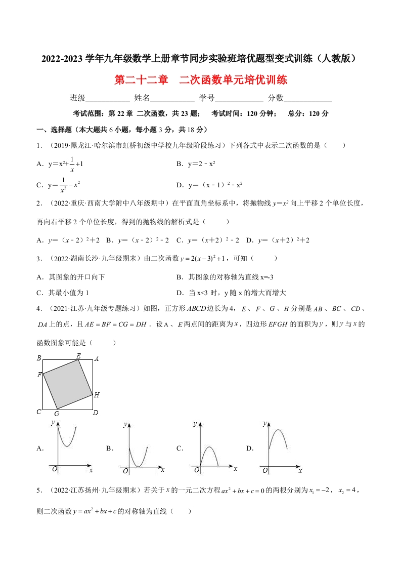 第二十二章 二次函数单元培优训练(原卷版)-2022-2023学年八年级数学上册章节同步题型变式训练(人教版)