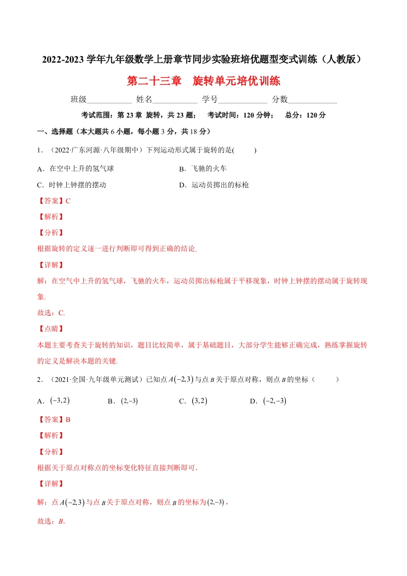 九年级上期末数学第二十三章 旋转单元培优训练(解析版)