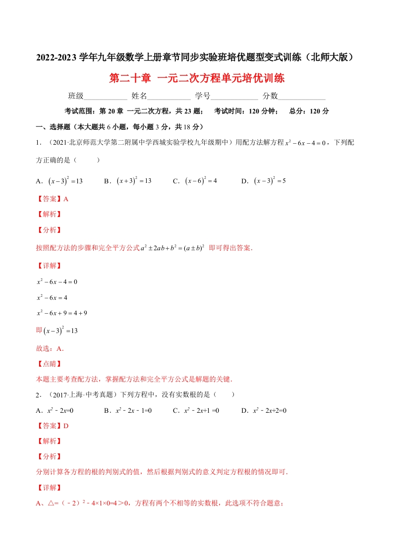 首页初中数学九年级第二十章 一元二次方程单元培优训练(解析版)-2022-2023学年八年级数学上册章节同步实验班培优题型变式训练(人教版)