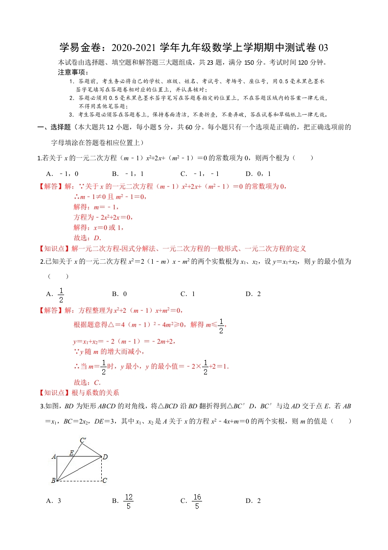 九年级数学上学期期中测试卷03(人教版)(解析版)