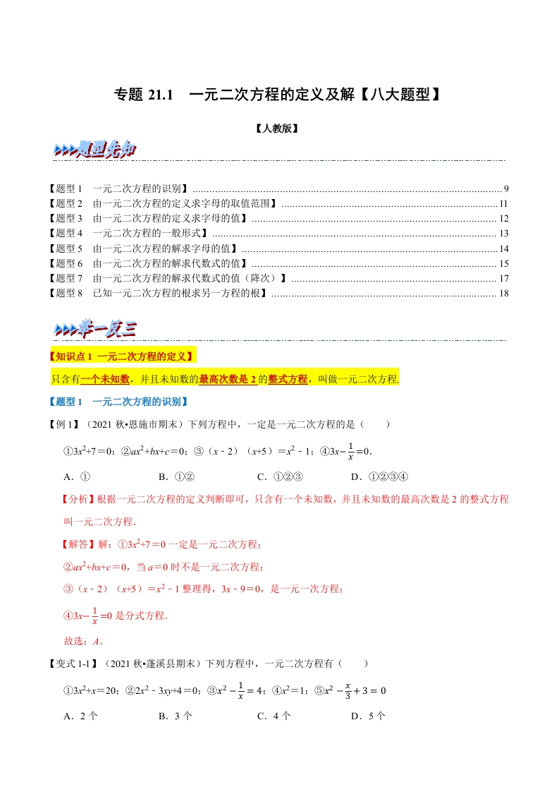 首页初中数学九年级九年级上期末数学专题21.1 一元二次方程的定义及解【八大题型】(人教版)(解析版)