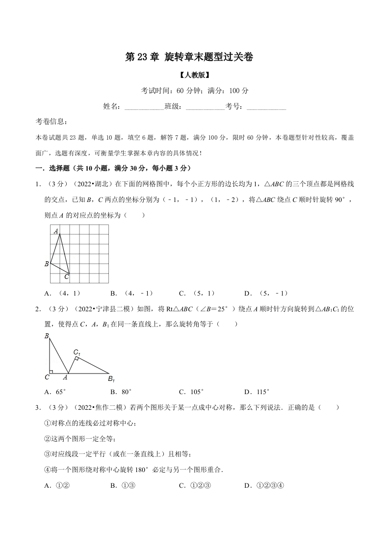 首页初中数学九年级九年级上期末数学专题23.2 旋转章末题型过关卷(人教版)(原卷版)