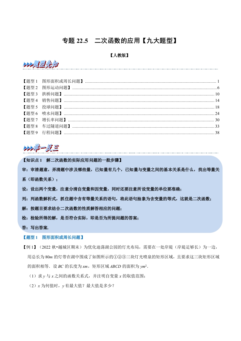 九年级上期末数学专题22.5 二次函数的应用【九大题型】(人教版)(解析版)