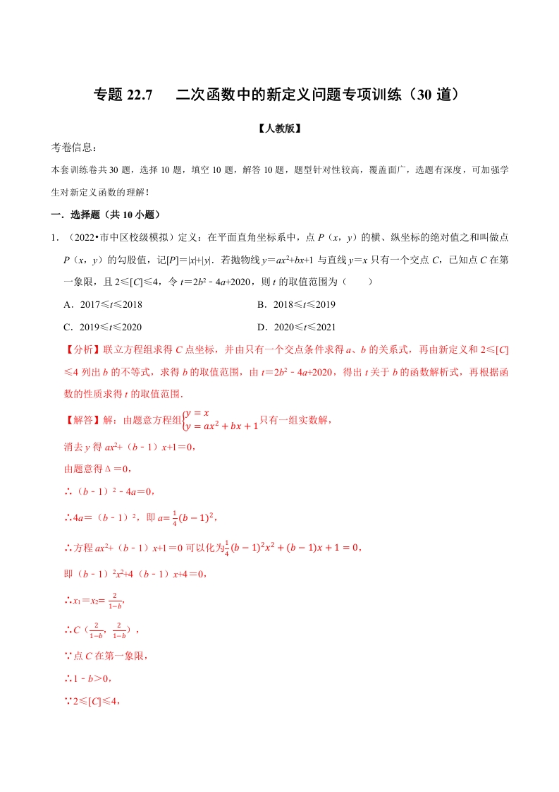 首页初中数学九年级九年级上期末数学专题22.7 二次函数中的新定义问题专项训练(30道)(人教版)(解析版)