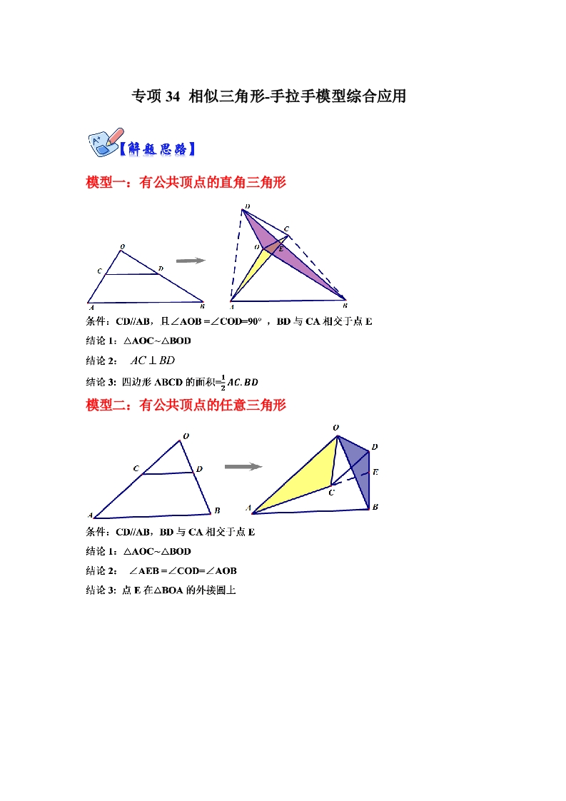 首页初中数学九年级九年级下册数学专项34 相似三角形-手拉手模型综合应用(原卷版)