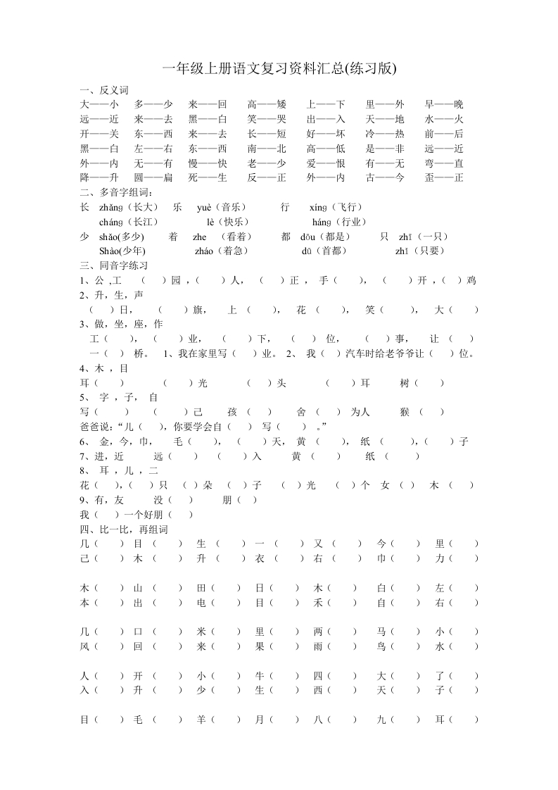 一年级上册语文复习资料汇总(整理打印版)