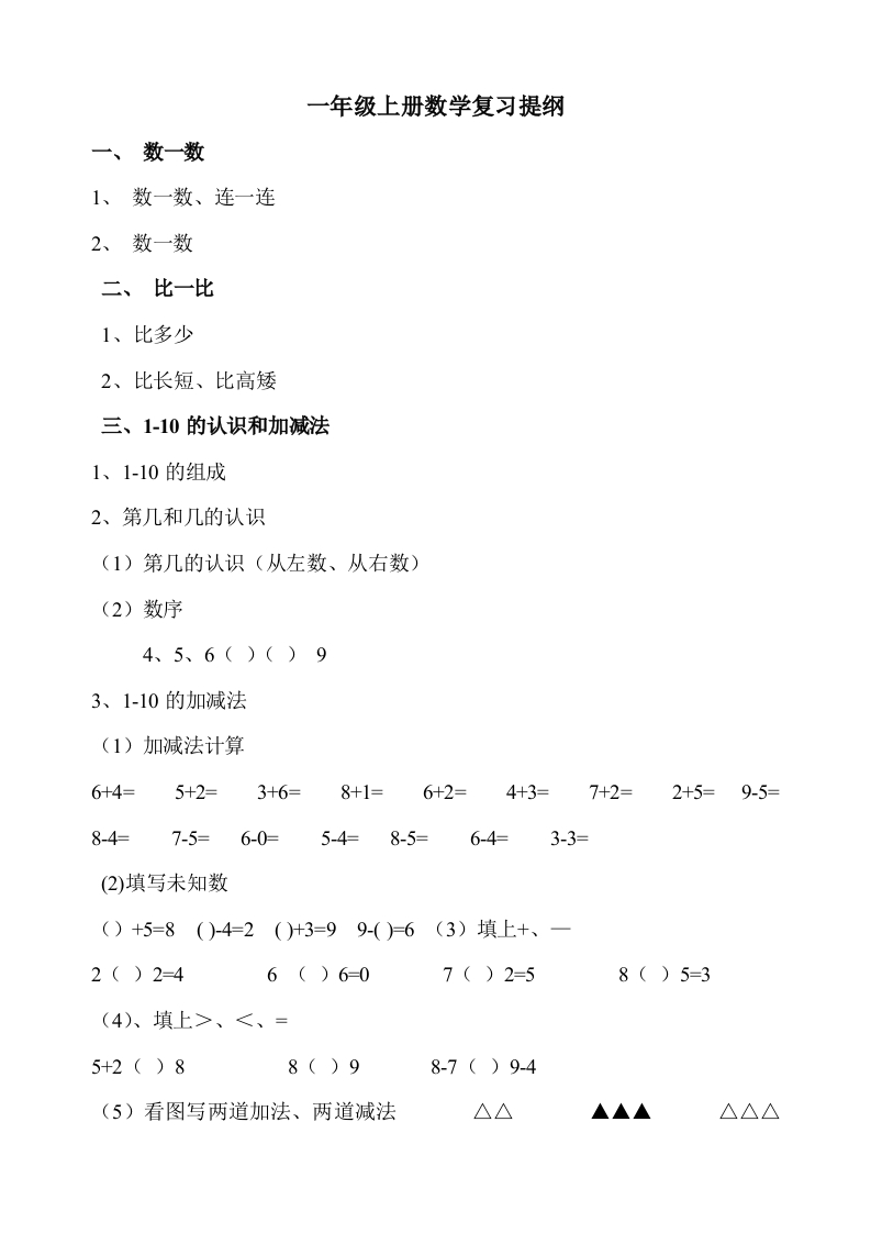 一年级上册数学复习提纲和知识点