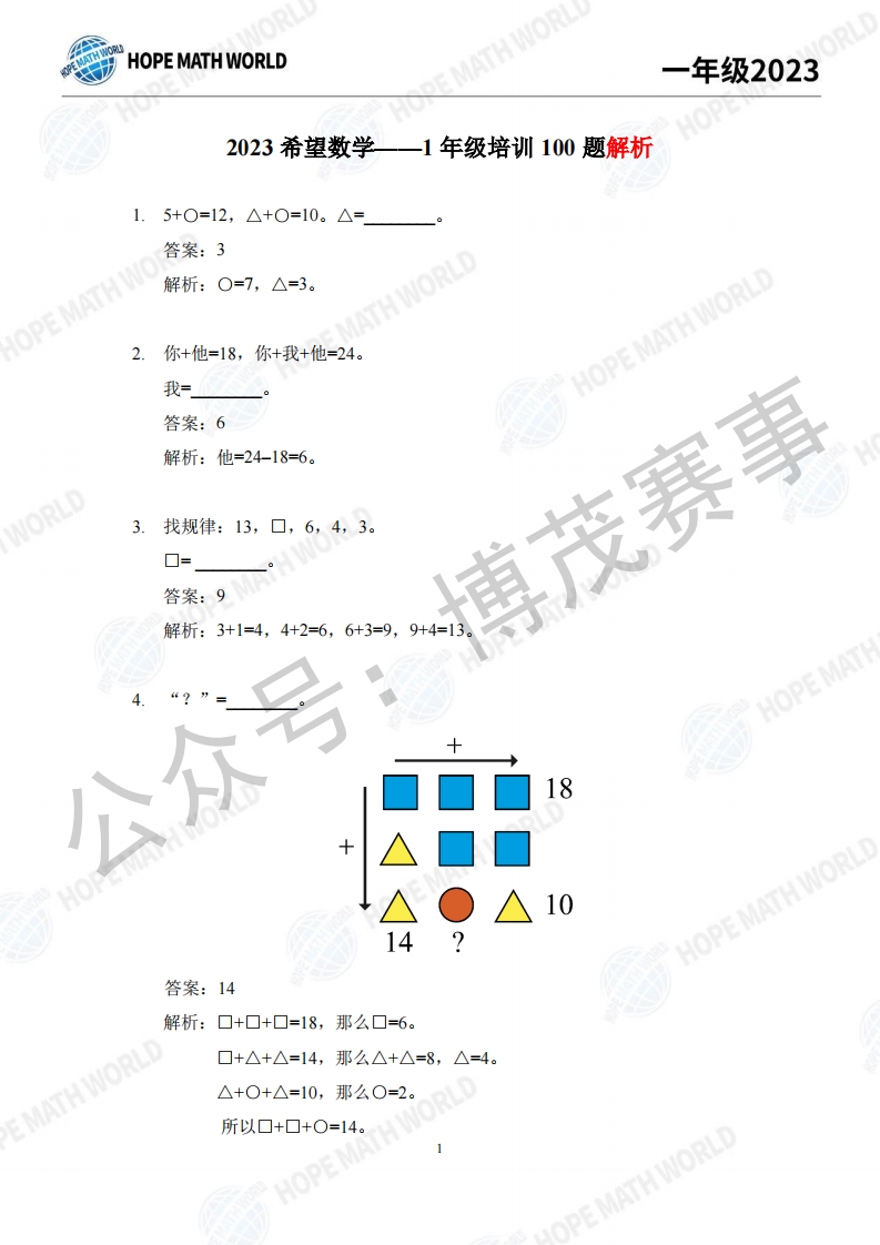 首页小学数学一年级2023培训题1年级-解析版希望杯