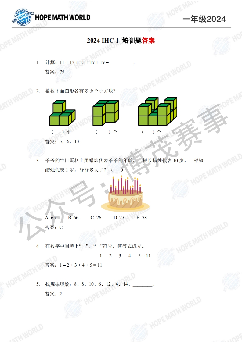 首页小学数学一年级2024培训题1年级-答案版希望杯