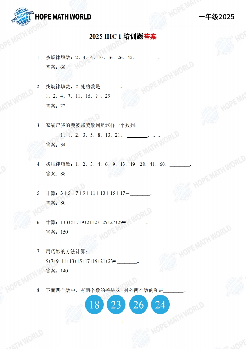 首页小学数学一年级2025培训题1年级-答案版希望杯