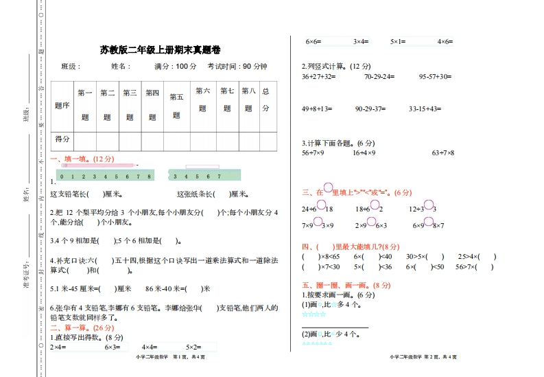 首页小学数学二年级苏教版数学二年级上学期期末测试卷8