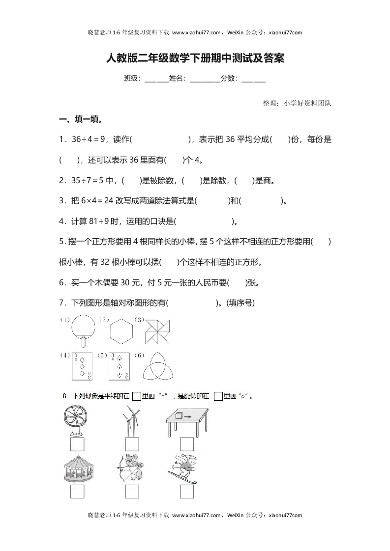 首页小学数学二年级人教版二年级数学下册期中测试卷(4)