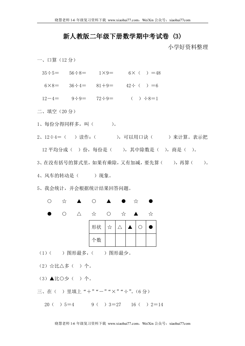 首页小学数学二年级人教版二年级数学下册期中测试卷 (3)