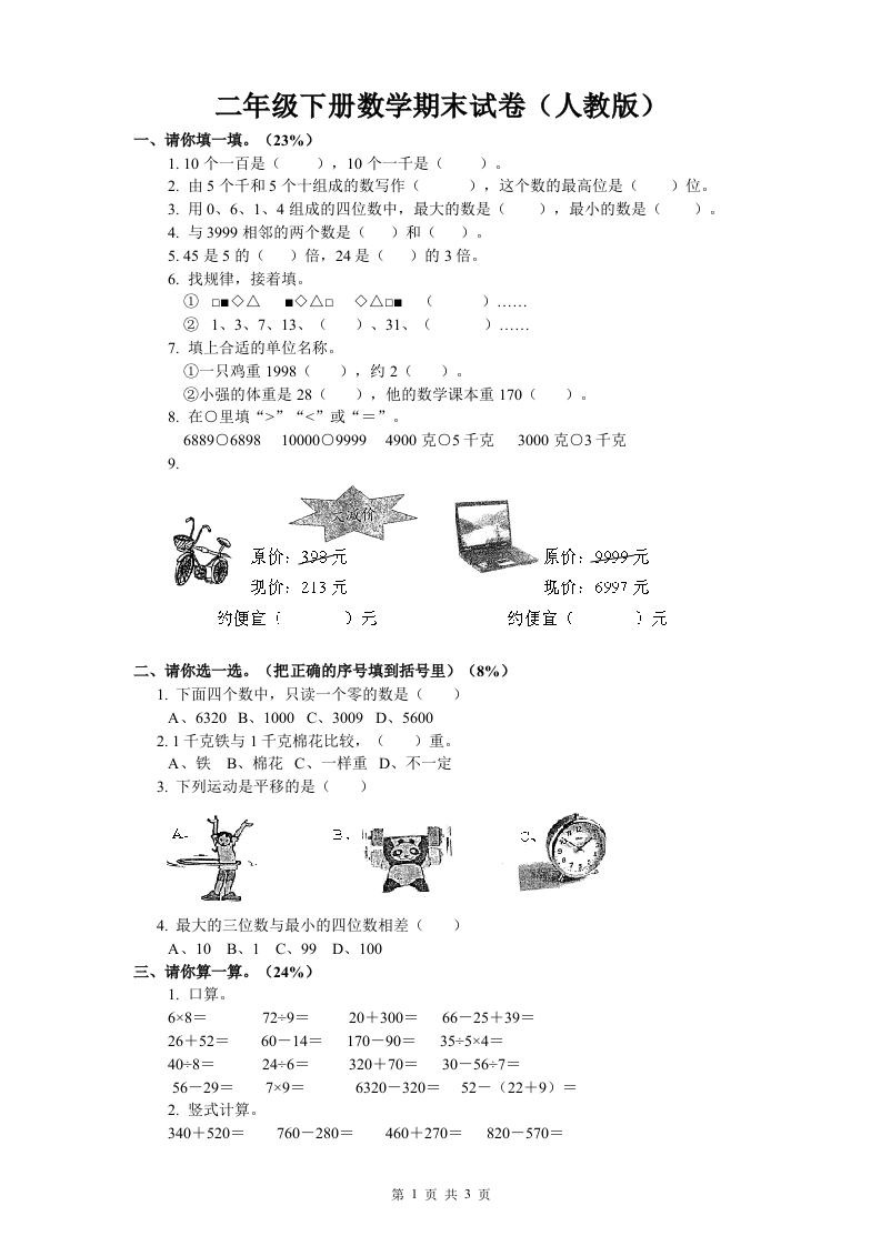 小学二年级下册数学期末试卷(人教版)