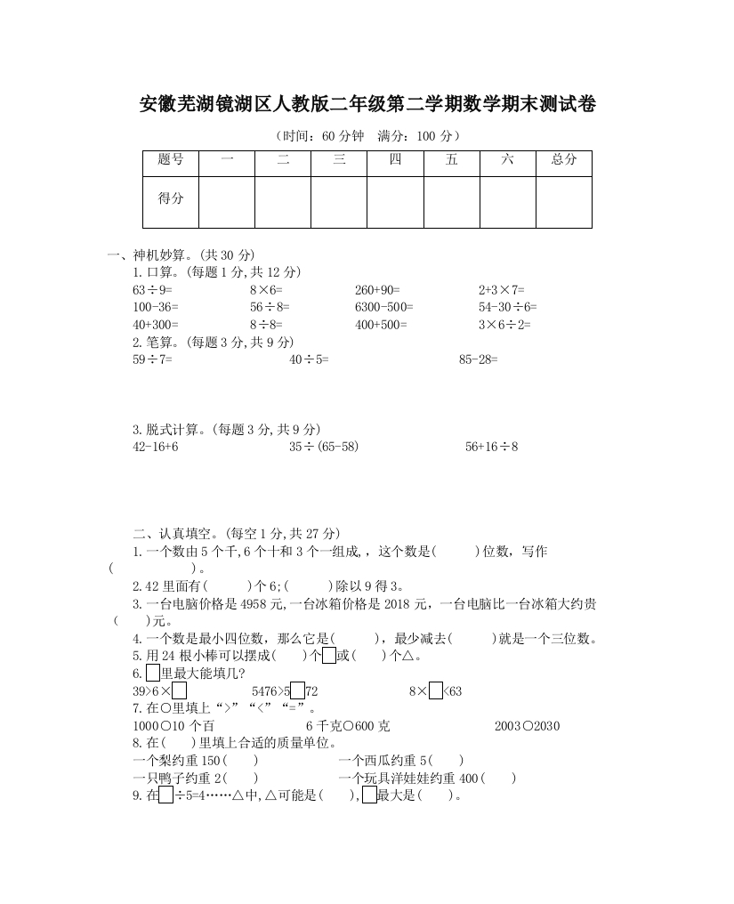 首页小学数学二年级安徽芜湖镜湖区人教版二年级第二学期数学期末测试卷含答案