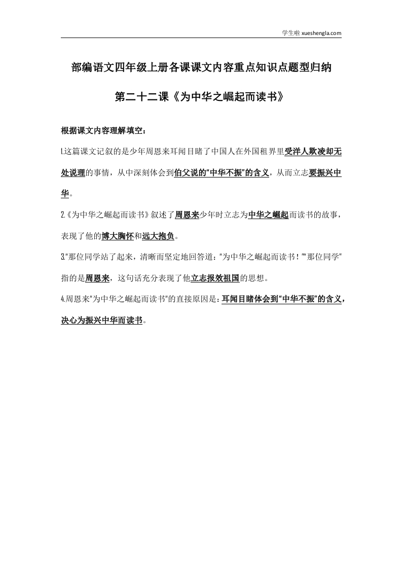部编语文四年级上册第22课课文内容重点知识点题型归纳
