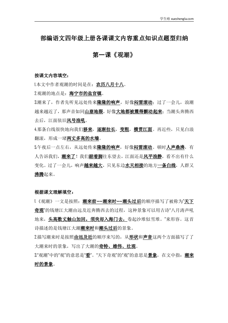 部编语文四年级上册第1课课文内容重点知识点题型归纳