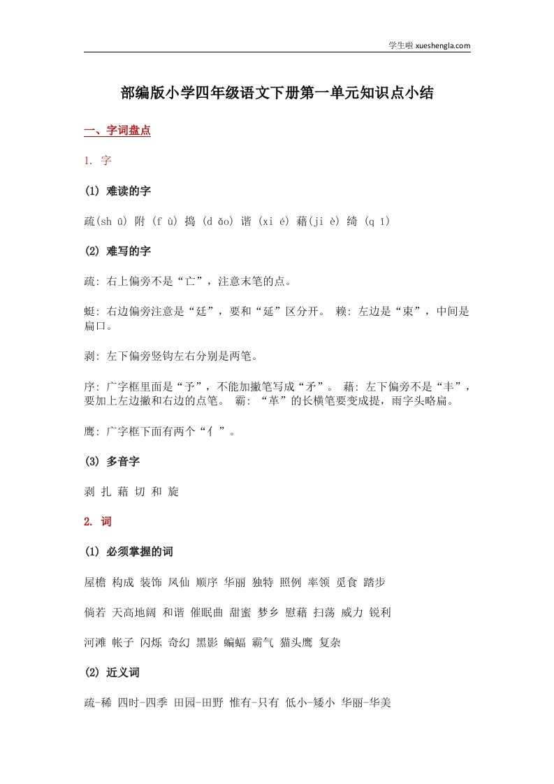首页小学语文四年级部编版小学四年级语文下册第一单元知识点小结