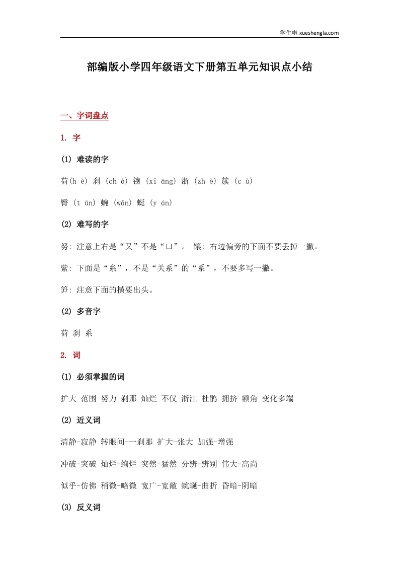 部编版小学四年级语文下册第五单元知识点小结