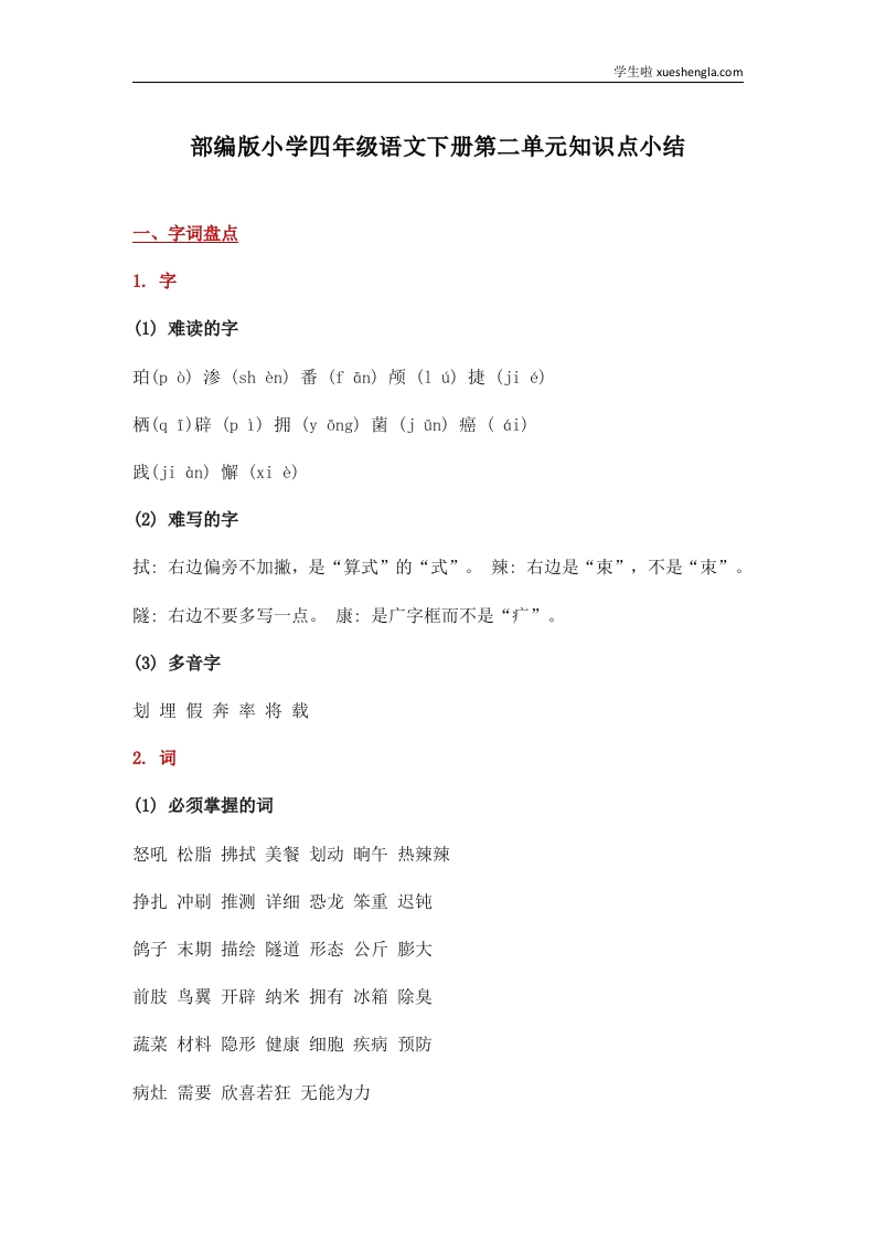 部编版小学四年级语文下册第二单元知识点小结