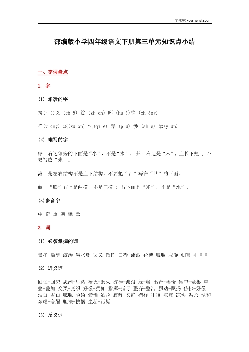 首页小学语文四年级部编版小学四年级语文下册第三单元知识点小结