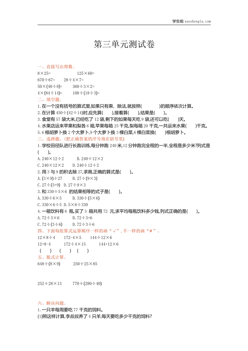 首页小学数学四年级冀教版数学四年级上册第三单元测试卷1及答案