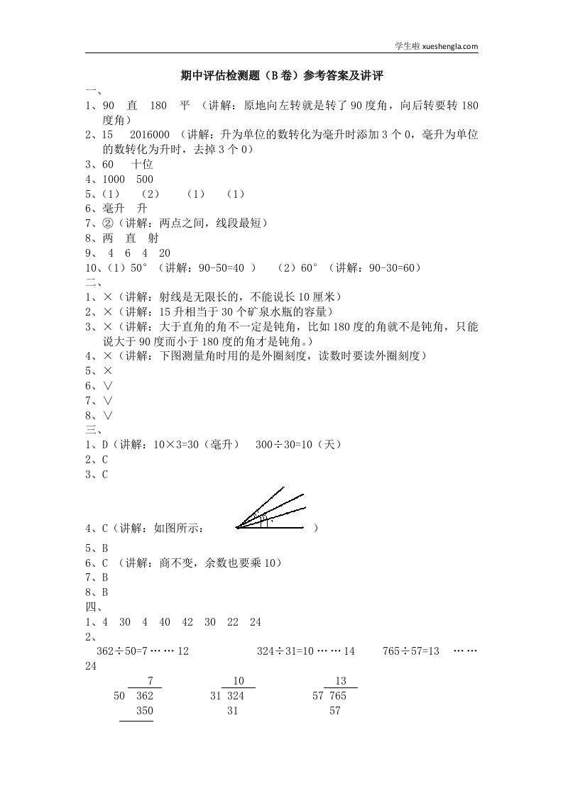 冀教版数学四年级上册期中评估检测题(B卷)参考答案及讲评