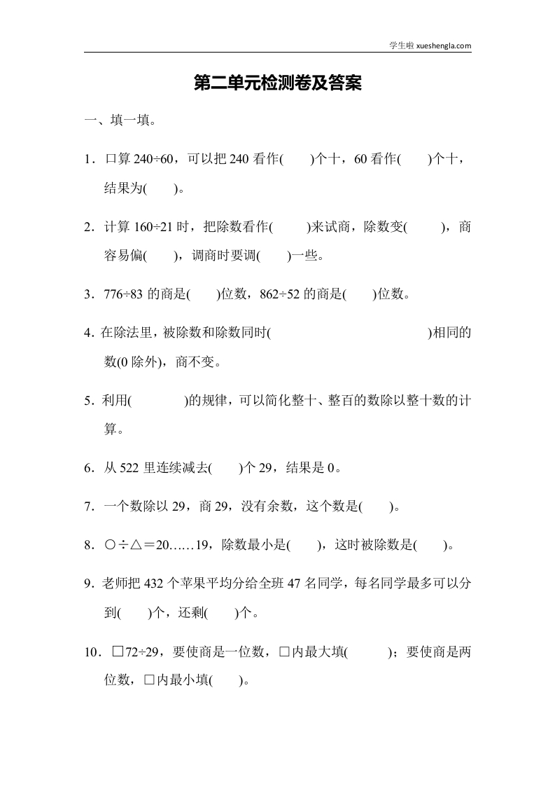 首页小学数学四年级冀教版四年级上册数学第二单元检测卷及答案