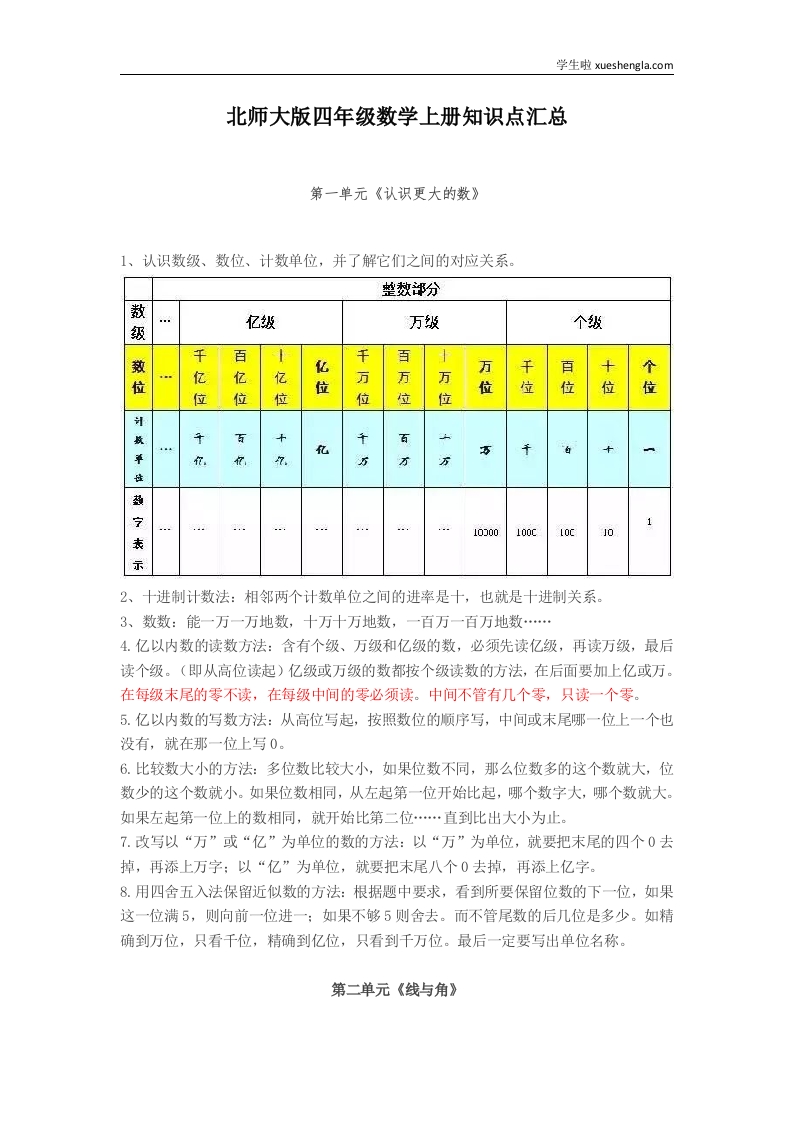 首页小学数学四年级4北师大版四年级数学上册知识点汇总