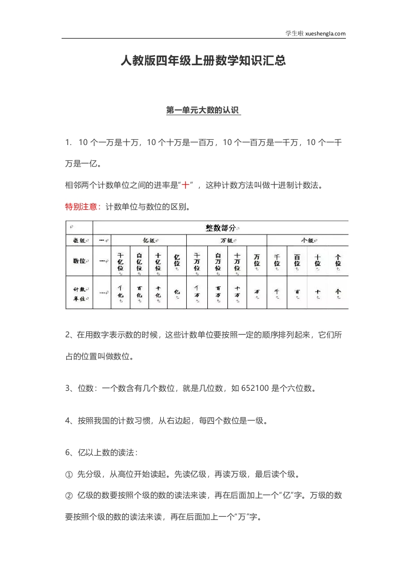 首页小学数学四年级人教版四年级上册数学知识汇总