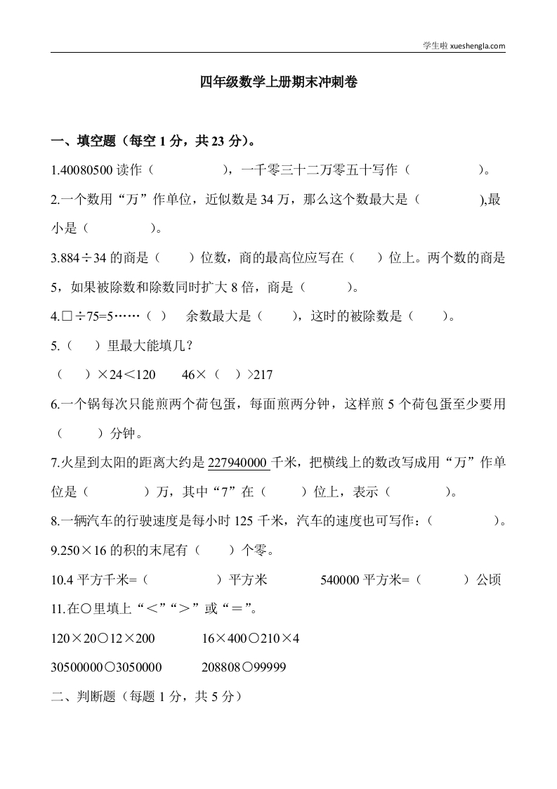 首页小学数学四年级四年级数学上册期末冲刺卷3