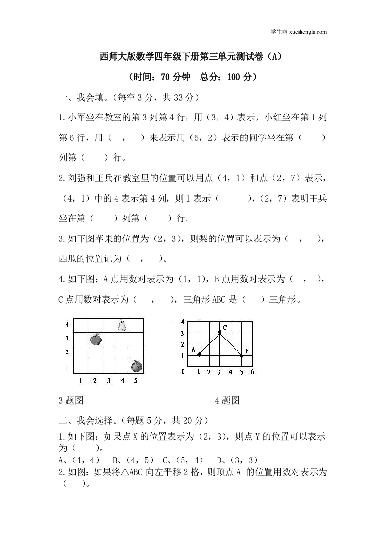 西师大版数学四年级下册第三单元测试卷(A)及答案