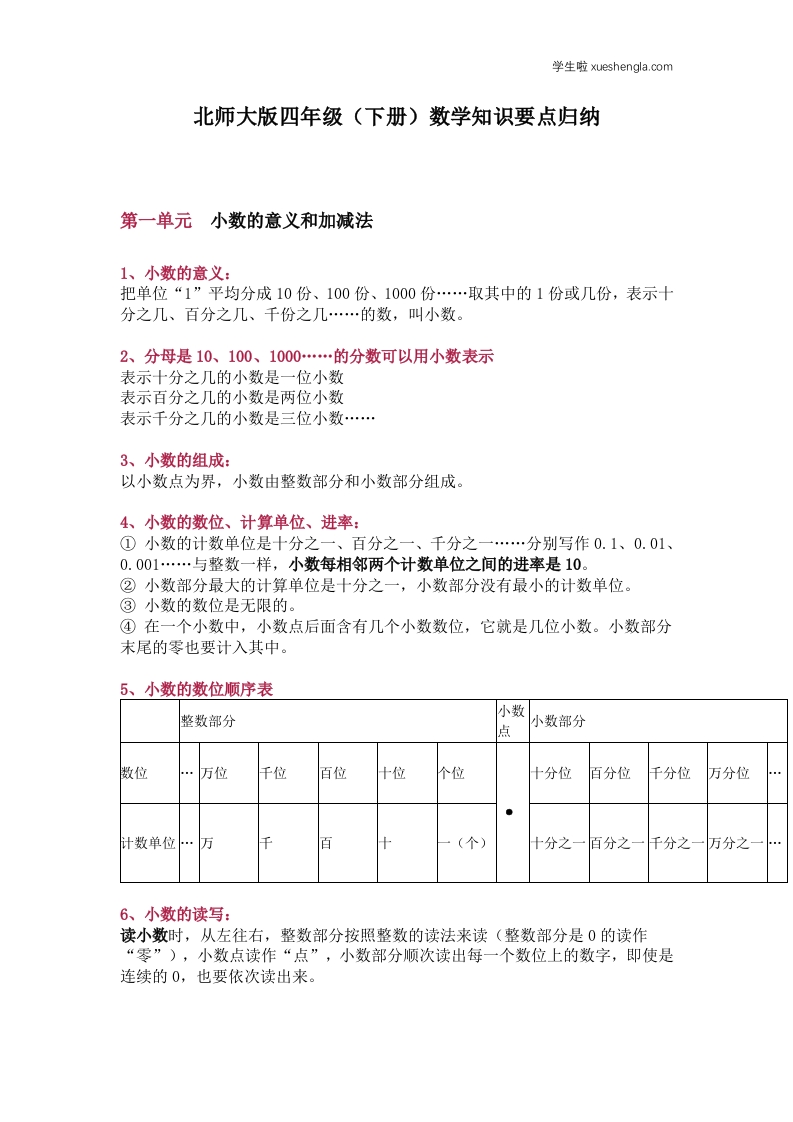 首页小学数学四年级北师大版四年级(下册)数学知识要点归纳