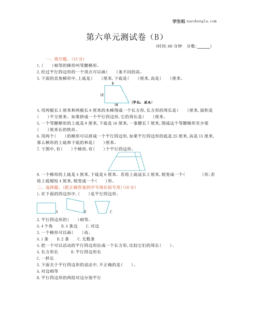 西师大版数学四年级下册第六单元测试卷(B)及答案