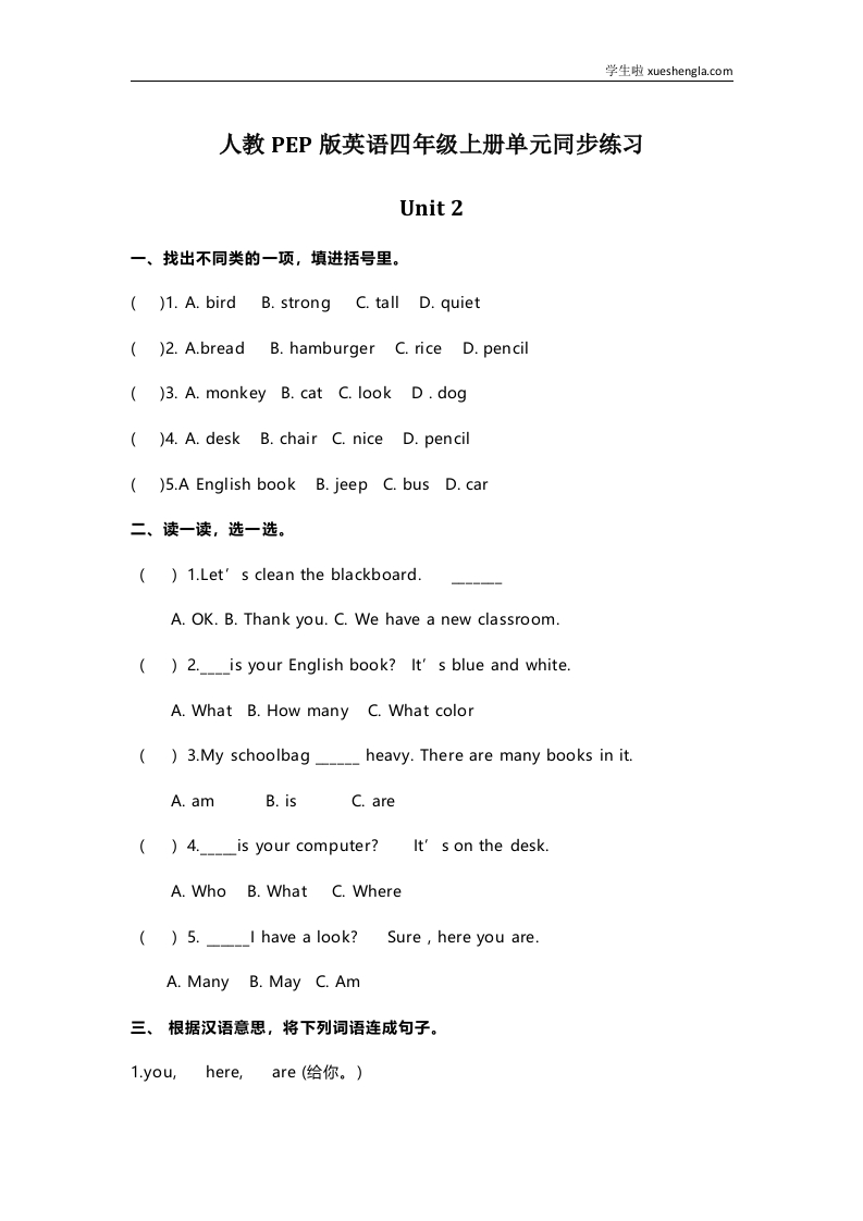 首页小学英语四年级人教PEP版英语四年级上册Unit2单元同步练习