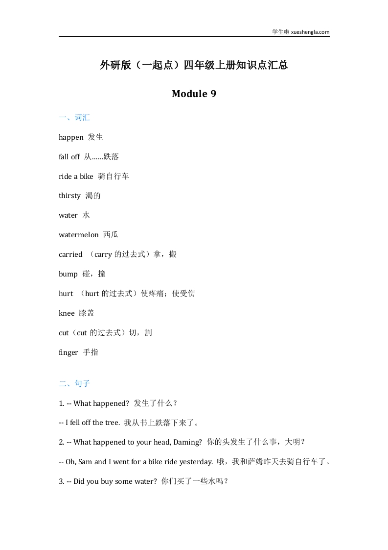 外研版(一起点)英语四年级上册Module9知识点