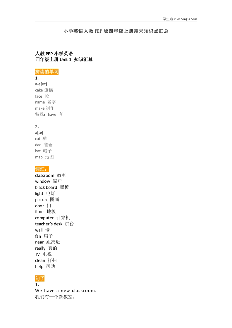首页小学英语四年级小学英语人教PEP版四年级上册期末知识点汇总